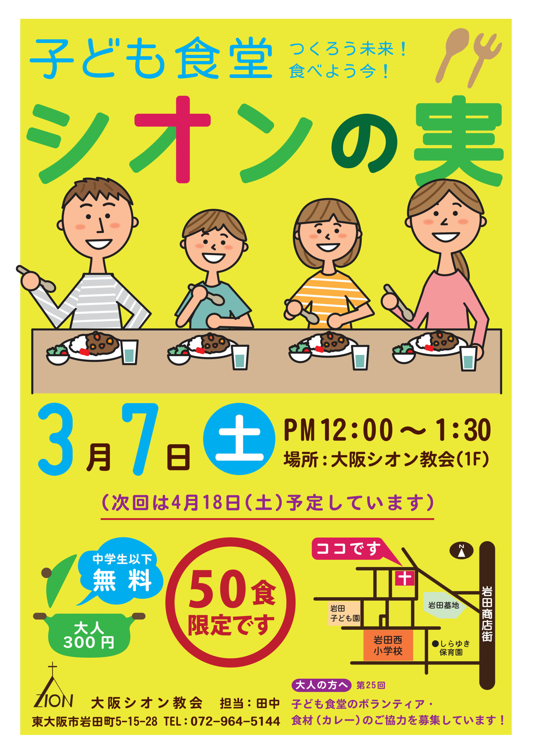 2026年3月4日 / 最終更新日 : 2026年3月4日 大阪シオン教会 NEWS 3月7日(土)子ども食堂シオンの実 開催2月プログラム 子ども食堂 開催!場所:大阪シオン教会(1F) PM12:00~1:30 50食限定 中学生以下、無料 大人300円多くの子供達が 教会につながりますよう お祈りください。Follow me! @osakazion